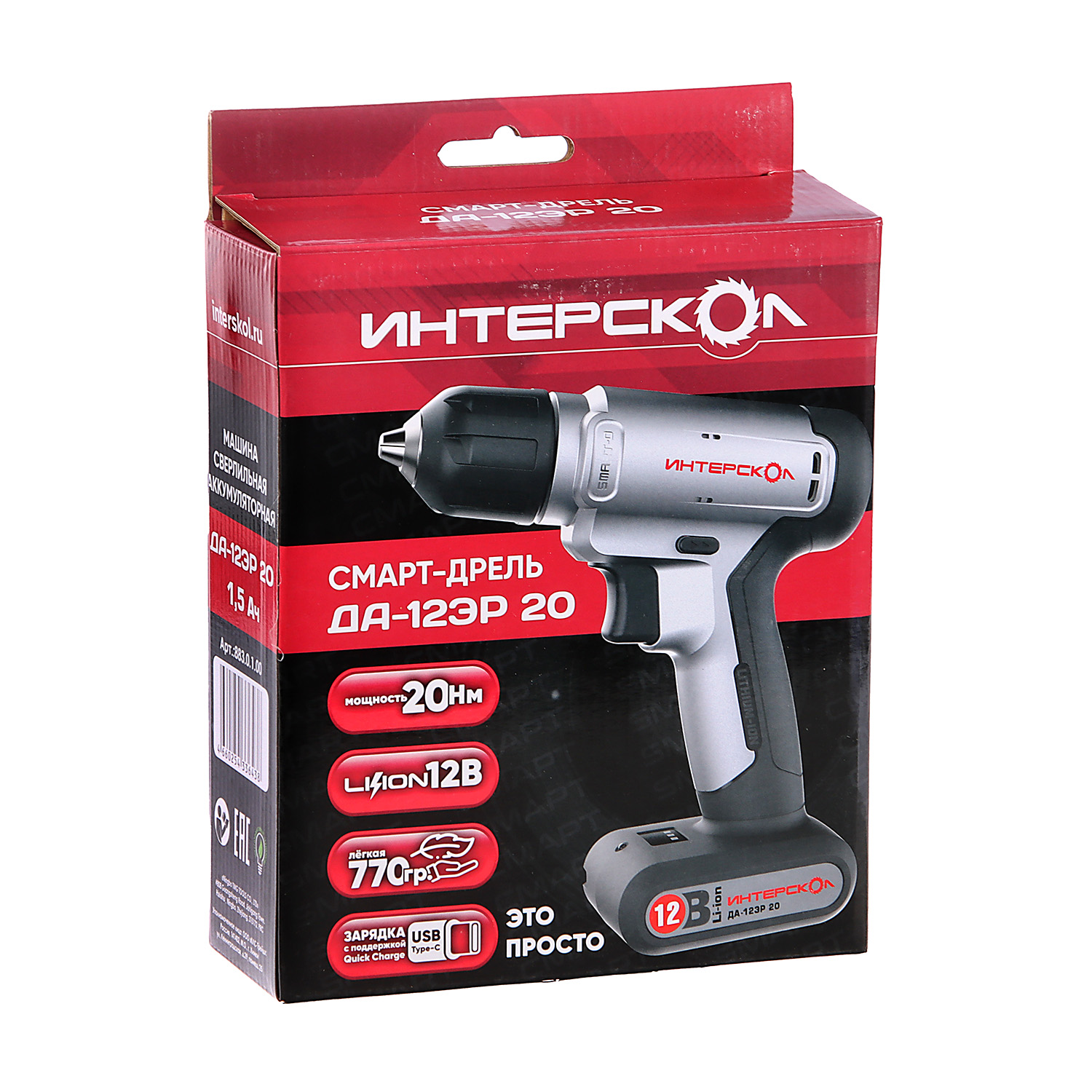 Дрель-шуруповерт 12В 1скор.0-700об/мин 20Нм 1,5Ач 1ч 1акк LI-ION ДА-12ЭР 20 СМАРТ-Д ИНТЕРСКОЛ *1/10