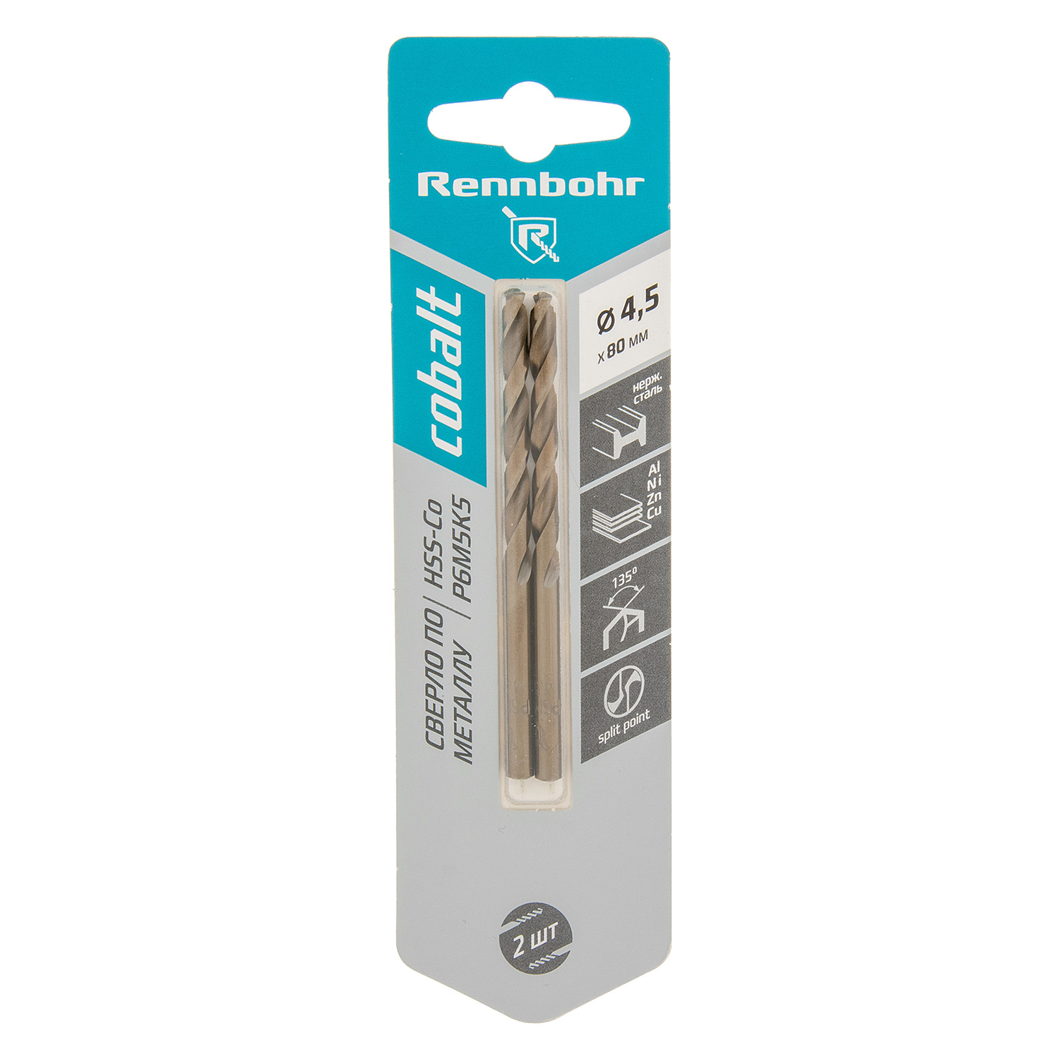Сверло по металлу 4,50*80/47мм HSS-Co P6M5К5 (2шт) блистер арт.668045 COBALT RENNBOHR *10/40/640