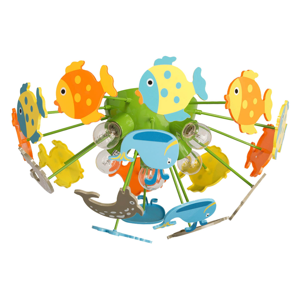 Яркий и динамичный светильник из коллекции Улыбка создан специально для детской комнаты. В светильнике использована концепция морской тематики, абажур состоит из красочных морских обитателей, изготовленных из высококачественного АБС-пластика. Он хорошо зарекомендовал себя в мировой практике как безопасный и прочный материал с высокими эксплуатационными качествами.