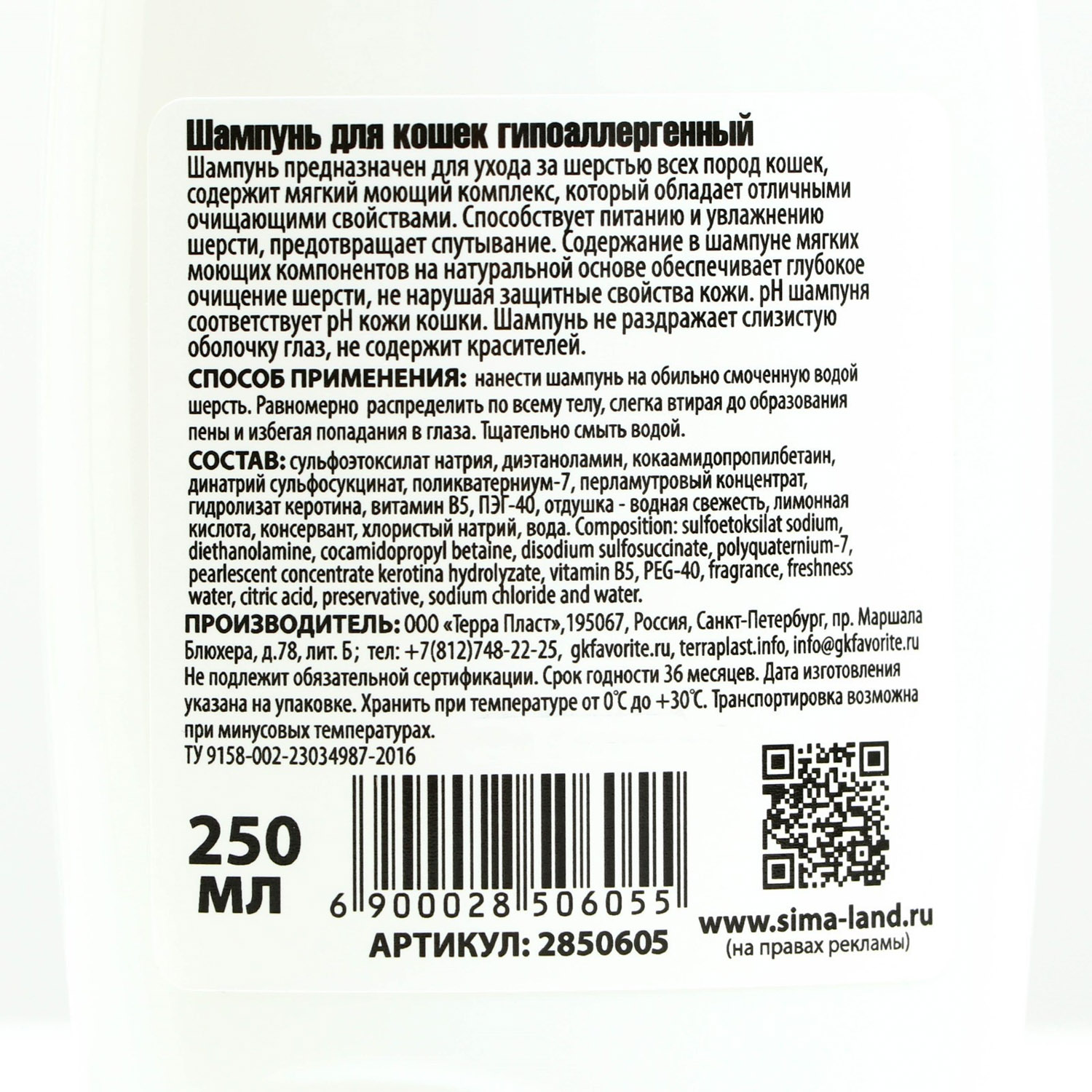 Шампунь "Пижон" гипоаллергенный, для чувствительной кожи, для кошек, 250 мл     2850605